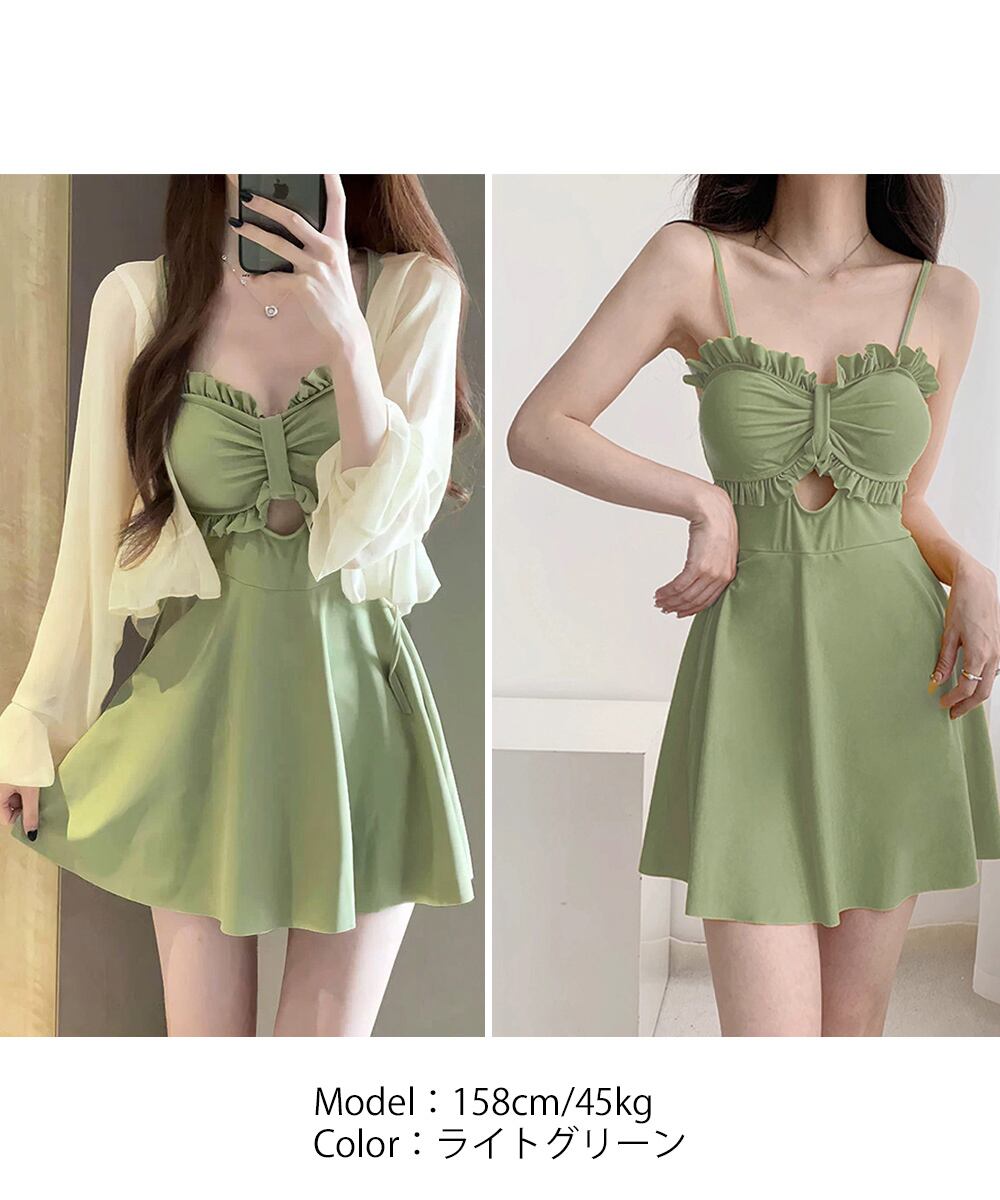 露出を控えたい方や肌見せが苦手な方でも取り入れやすい、カーディガンとワンピースの水着2点セット