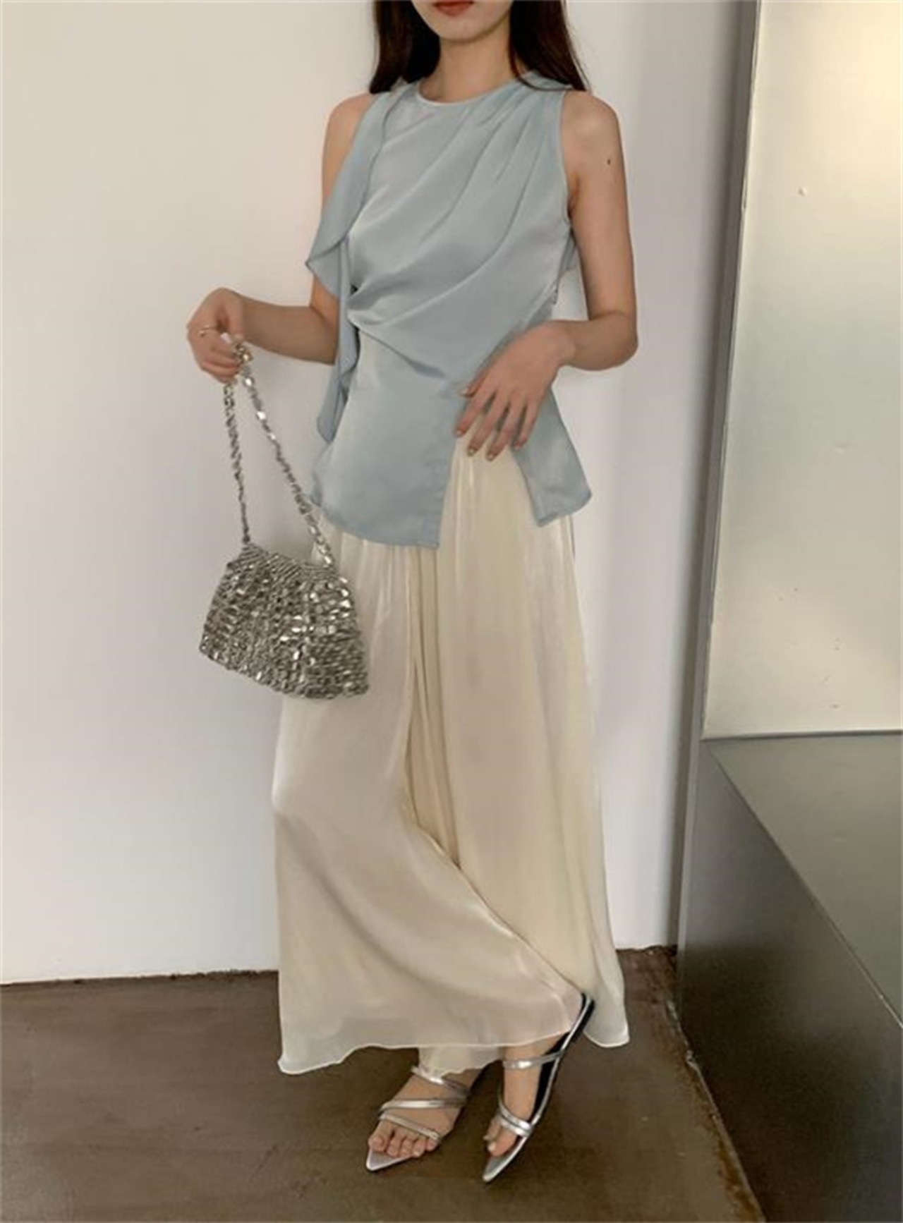 レースフリル加工 アシンメトリックデザイン ノースリーブシャツ ラウンドカラー